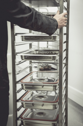- Hoher Regalwagen für GN 2/1, 1/1, 2/4 aus Edelstahl zum Einfahren in Hochkühlschrank